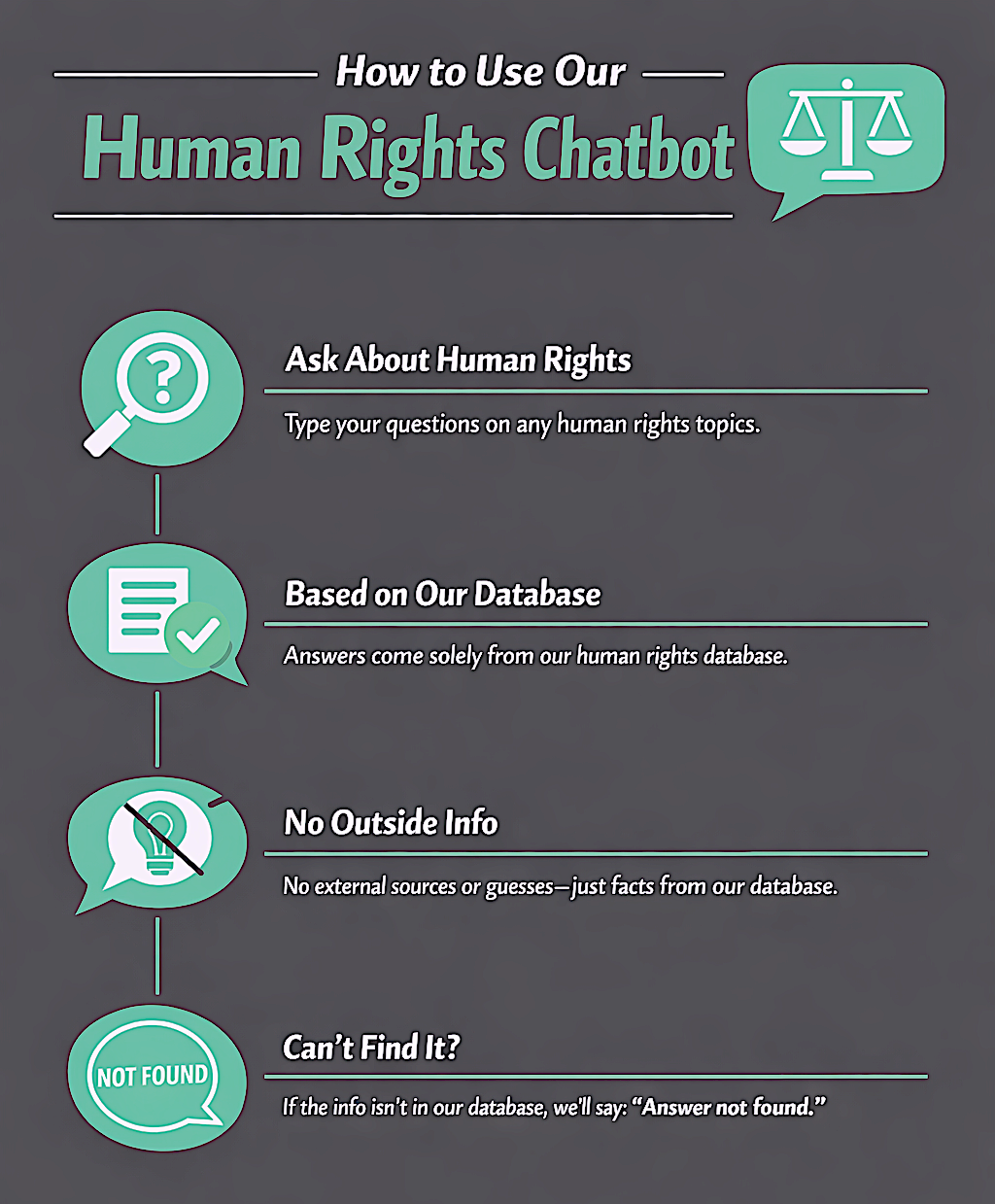 This is why AWG developed for us a tailor-made conversational chatbot that answers any question on human rights, using the treaties and conventions as sole source and reference. This secures answers that are accurate, sourced and reliable.